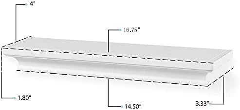 HIGH-QUALITY MATERIALS:These beautiful white shelves are made of durable MDF,so they can be a part of your home decor for years to come. Each white floating shelf measures 1.8inch high, 16 3/4inches width, and 4inch deepth; The entire weight of the floating shelves white is 3.2 lbs