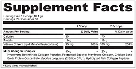 Hydrolyzed Bovine Hide Collagen Peptides, Fermented Eggshell Membrane Collagen, Chicken Bone Broth Protein Concentrate, Bacillus coagulans (2 Billion CFU), Hydrolyzed Fish Collagen Peptides