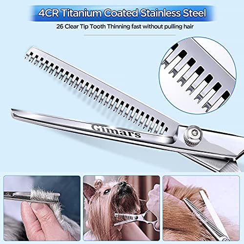 【Complete home gooming essentials sets】these pet grooming scissors includes 6.69 inch thinning shears for dogs, 7 inch curve scissors for dog, 6.1 inch and 5.1 inch straight scissors, stainless steel comb, cleaning cloth, and storage case. perfect for trimming ears, paws, collar, sides and combing through a long, thick coat and relaxes pets
