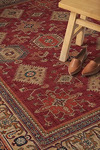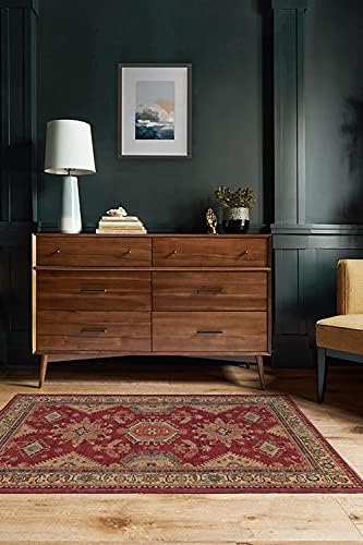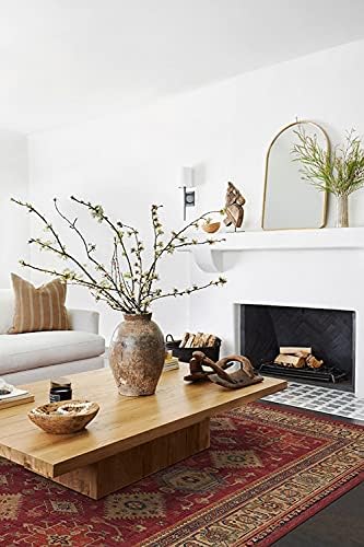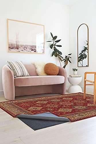 VERSATILE PLACEMENT: The entire rug system is 1/4 inches thick, and is perfect for indoor placement under furniture, in entryways, or in high-traffic areas throughout your home: hallway, living room, dining room, bedroom. The intricate pattern work is reminiscent of a red Persian rug and is elegantly rendered in hues of ruby red, blood orange, beige, and brown hues