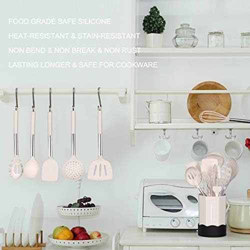 ✅A GREAT COMPANION IN THE KITCHEN: Prepare for many sessions of exciting cooking! Grill, whip cream, stir sauces, mix ingredients, flip eggs, burgers or pancakes, pan fry or stir fry as much as you wish. No excuses! an extra utensil holder that allow you to store all your kitchen gadget utensil set conveniently, Solid holder base ensures utensils fit properly, circular opening at the bottom ensures that the silicone cooking utensils in the holder is always kept in a dry environment