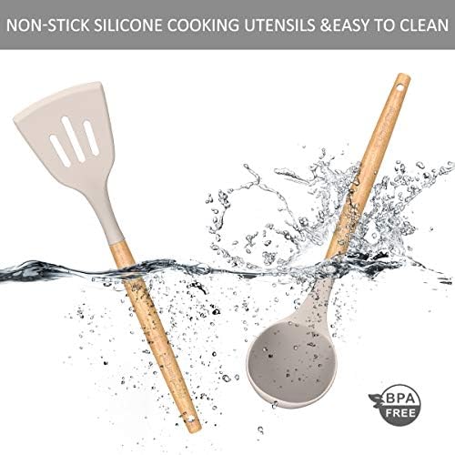 ✅HIGH TEMPERATURE WITHSTAND:The Silicone Cooking Utensils can withstand high temperatures up to 446°F/230°C. All-around silicone added to the softness, no longer worry food will stick your cookware. Silicone head protect your pans, keep the cookware surface not scratched or dented. Extend the life of all your kitchen pans.They are scratch resistant, unlike plastic and rubber utensils that will easily melt or metal kitchen utensils harm your nonstick pots